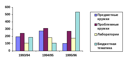 Такое внимание к НИРС во многом обусловлено спадом произошедшим в ней в последние годы. Так, если в 1993/1994 учебном году насчитывалось 17 предметных кружков, в работе которых принимали участие 196 студентов, а в 1994/1995- 29 кружков и 275 работающих в них студентов, то в 1995/1996 годах произошёл заметный спад, и осталось 15 кружков со 104 активными участниками. Аналогичная ситуация наблюдалась и с проблемными кружками: 33 кружка и 312 студентов в 1994/1995 учебном году, 28 и 272 в 1995/1996 учебном году соответственно. Этот факт можно объяснить тем, что реформы, идущие давно и не слишком эффективно, нанесли очередной удар по населению, а именно -невыплата заработной платы из исключения превратилась в хорошо соблюдаемое правительством правило. В связи с этим многие студенты оказались без финансовой поддержки со стороны родителей, и были вынуждены сами зарабатывать средства к существованию, что заняло время, прежде уделяемое НИРС. Не будет большим открытием тот факт, что большинство участников НИРС являются выходцами из семей, где родители также имеют некоторое отношение к образованию и науке, т. е. именно к тем отраслям народного хозяйства, которые находятся на полном бюджетном обеспечении. Именно такие студенты и попали под удар. Студенческие лаборатории оказались более выносливыми, и их количество(7 кафедральных и 1 межкафедральная) осталось неизменным до настоящего времени, а число занятых в них студентов так же значительно не изменилось(185 в 1994/1995 у. г. и 176 в 1995/1996 у. г.). Это подтверждает тезис о том, что в работе лабораторий принимают участие более опытные и увлечённые студенты, которые остаются преданными науке, не взирая на обстоятельства. Однако в некоторых областях научной деятельности студентов наметился явный рост. Например, в работе по бюджетной тематике кафедр в 1993/1994 у. г. приняли участие 189 студентов, в 1994/1995 у. г. -108, а в 1995,1996 у. г. уже 537 студентов. Видимо, студенты ощутили на собственном опыте, что сегодня очень важно разбираться в бюджете нашего государства, и поле для деятельности выглядит бескрайним, потому что бюджетная политика меняется каждые полгода.