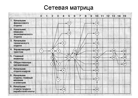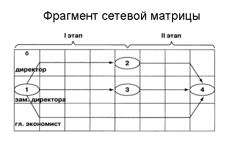 Сетевые матрицы, как было сказано выше, это более высокий уровень научной разработки сетевых графиков. Они представляют собой «графическое изображение процессов осуществления проекта, где все работы (управленческие, производственные) показаны в определенной технологической последовательности и необходимой взаимосвязи и зависимости» 2.