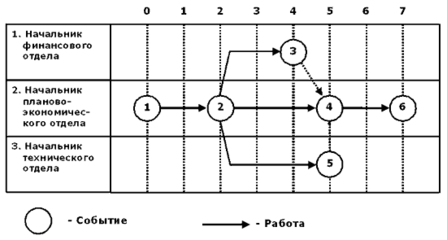 Она совмещается с календарно-масштабной сеткой времени, которая имеет горизонтальные и вертикальные «коридоры»: горизонтальные «коридоры» характеризуют ступень управления, структурное подразделение или должностное лицо, выполняющие ту или иную работу; вертикальные — этап и отдельные операции процесса управления проектом, протекающие во времени (Приложение 1).