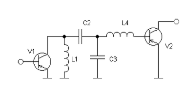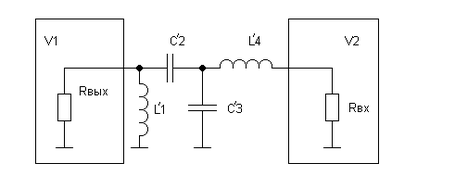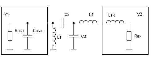 Аппроксимируя входной и выходной импедансы транзисторов V1 и V2 RC- и RL-цепями, от схемы приведённой на рис. 1 перейдём к схеме приведённой на рис.2.