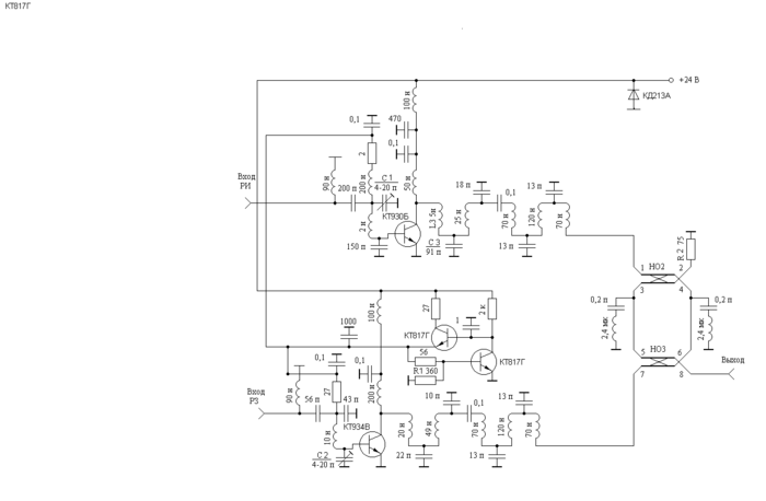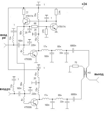 Из всего рассмотренного нашли, что в ДМВ диапазоне так же как и в МВ диапазона, где применяются усилители мощности с раздельным усилением радиосигналов изображения и звука и с последующим сложением их мощностей на мостовых схемах сложения или на диплексерах, возможно применение раздельного усиления радиосигналов изображения и звука с последующим сложением их на диплексере либо на НО для получения на выходе передатчиков заданных соотношений Риз/Рзв равных 10:1, соотвествующих нормам ГОСТа.