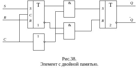 Другой способ ликвидации гонок заключается во введении двойной памяти. В этом случае каждый элемент памяти дублируется, причем перепись из первого элемента памяти во второй происходит в момент С = 0(рис.38.).