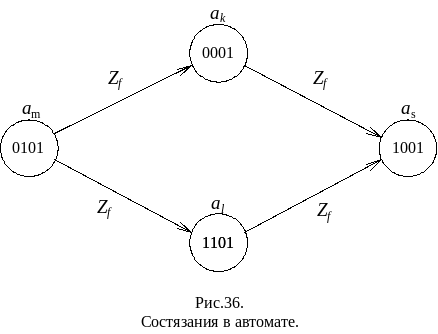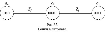 Если же в этом автомате есть переход, например, из аk в аj аs под действием того же сигнала Zf, то автомат может перейти в аj, а не в аs и правильность его работы будет нарушена (рис.37.).