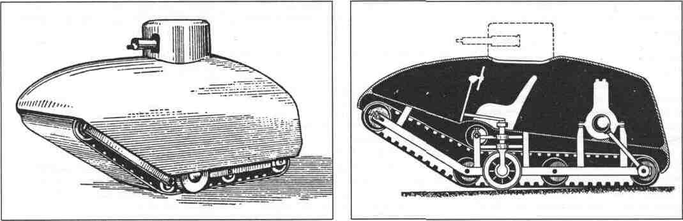 ершенство движителя, поэтому детально разрабатывался первый вариант. Это был сравнительно легкий «аппарат» массой 3,5—4 т, то есть уровня танкетки. Несущей конструкцией являлась стальная рама, к которой крепились направляющий и три опорных (из них задний — ведущий) пустотелых барабана. Оси направляющего барабана вводились в специальные прорези рамы и фиксировались двумя винтами. Его перемещением вдоль прорезей регулировали натяжку гусеницы. Кроме того, существовал дополнительный натяжной барабан, формирующий верхнюю ветвь гусеницы, проходящую под всем днищем корпуса. Ходовая часть закрывалась фальшбортом.