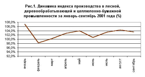 Картонная тара является продуктом лесной, деревообрабатывающей и целлюлозно-бумажной промышленности, поэтому целесообразно обратиться к данным по развитию производства в этой сфере. На рис. 1 видна динамика производства лесной, деревообрабатывающей и целлюлозно-бумажной промышленности за январь-сентябрь 2001 года. Спад производства произошел только в феврале месяце на 1,7%. Средний рост производства за январь-сентябрь 2001 года по сравнению с аналогичным периодом 2000 года составил 2,5%. Минэкономразвития и торговли РФ прогнозирует рост производства продукции этой отрасли на 2001 год – 3,9%, на 2002 год – 4,2%.