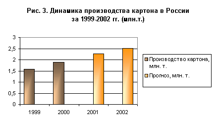 В целом за этот период было произведено картона на 13,5% больше, чем за аналогичный период прошлого года, тогда как Минэкономразвития РФ прогнозирует рост производства картона в 2002 году – на 11% (рис.3).