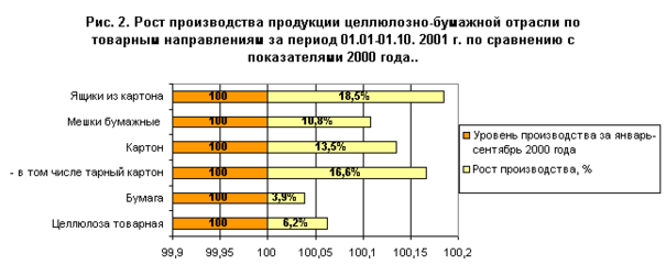 а рис. 2 отражена товарная структура целлюлозно-бумажной отрасли и динамика производства по каждому товарному направлению за три квартала 2001 года по сравнению с данными аналогичного периода 2000 года (источник - Госкомстат РФ).
