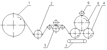 1- разматываемый рулон; 2 - бумаговедущий валик; 3 - механизм продольной резки; 4 - несущий вал; 5 - наматываемый рулон; 6 – прижимной вал; 7 – транспортер для заправки бумаги.