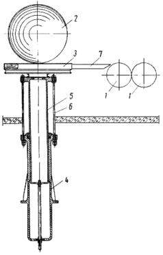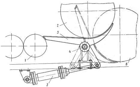 1 – несущие валы; 2 – наматываемый рулон; 3 – цилиндр; 4 – поперечный валик; 5 – поршень; 6 - шток
