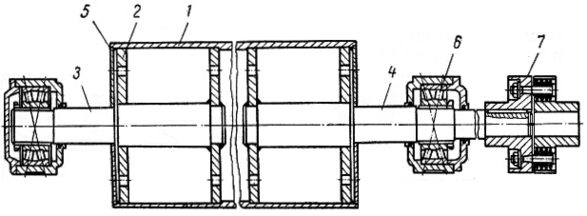 1 – цилиндр; 2 – диск сварного патрона; 3 и 4 – цапфы с лицевой и приводной сторон; 5 – щиток; 6 – подшипник качения; 7 – эластичная муфта