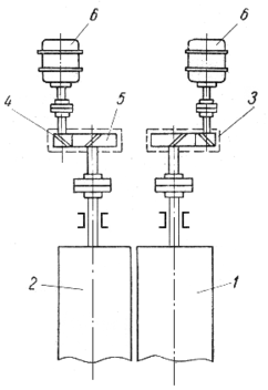 1 и 2 – первый и второй несущие валы; 3 – редуктор; 4 и 5 – ведущая и ведомая шестерни; 6 – электродвигатель