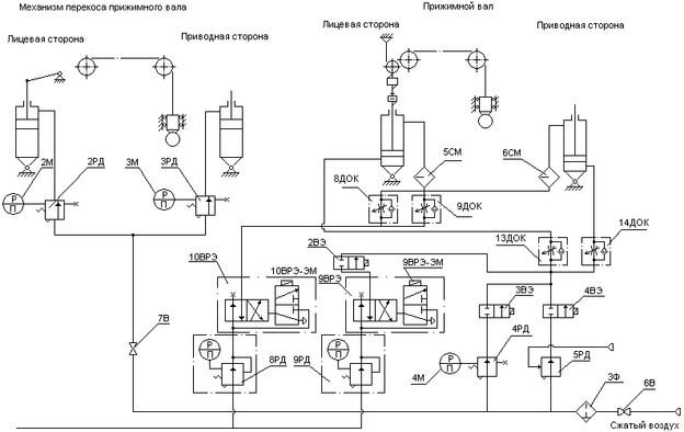 Воздух (рис. 5.1.1.) из магистрали поступает в штоковые полости цилиндров через регуляторы давления 2РД и 3РД, настраиваемые вручную независимо друг от друга для лицевой и приводной сторон. Контроль давления сжатого воздуха после регуляторов 2РД и 3РД производится по манометрам 2М и 3М, установленными как и регуляторы на пульте.
