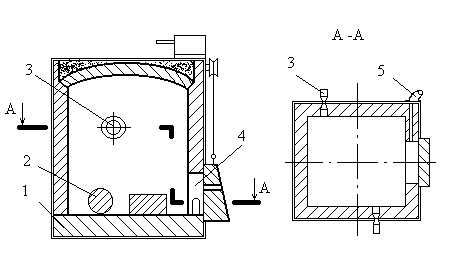 Наиболее распространенным типом печей является камерная печь, в которой заготовки 2 укладывают на под 1 печи через окно 4 и после прогрева до заданной температуры извлекают через то же окно. Рабочее пространство печи нагревают сжиганием газа с помощью горелок 3, служащих для смешения газа с воздухом и подачи смеси в печь. Продукты сгорания отводят через дымоход 5 в рекуператор – теплообменник, в котором поступающий к горелкам воздух нагревается теплотой горячих уходящих газов. Подогрев воздуха до температуры 350 – 500 оС позволяет экономить до 25% топлива. Для нагрева крупных заготовок применяют камерные печи с выдвижным подом и специальные посадочные машины.