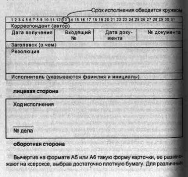 Заполнив карточку, одну из них помещают в сроковую картотеку, другую в информационно-справочную, а документ передают исполнителю для работы с ним.