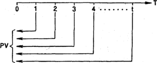 Для оценки эффективности инвестиций, т.е. сопоставления разно временных величин затрат и результатов (в общем случае - денежных потоков), используется процедура приведения их к одному момент времени - дисконтирование. Последнее состоит в вычислении текущего аналога денежных средств, выплачиваемых и (или) получаемых в различные моменты времени в будущем текущее (нынешнее) значение денежных средств является функцией их будущих значений ():