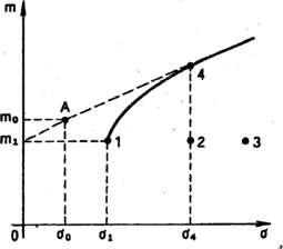 Добавим теперь портфель с нулевым риском и гарантированной ожидаемой эффективностью m . Для нового множества допустимых портфелей граница эффективности теперь изменится, и будет описываться кривой m - 4. Для этого множества портфелей портфель 1 перестал быть эффективным, так как портфель т имеет меньший риск, чем портфель 1 при одинаковой норме доходности.