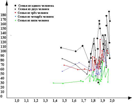 Анализ разнообразия потребительских расходов наиболее типичного компакта семей разного состава по численности показал, что увеличение среднего размера семьи сопровождается устойчивым снижением разнообразия расходов, то есть происходит сосредоточение всё большего объема расходуемых средств на всё более узком перечне товаров и услуг, и прежде всего товаров самой первой необходимости Из этого видно, что в современных условиях семьи, состоящие из трех и более человек , не имеют внешних достаточных стимулов к увеличению числа детей. Расчёты уровня разнообразия расходов у наибольшего компакта семей различного состава показывают ,что разнообразие их расходов независимо от состава практически неизменно. Это значит, что расширение численного состава семьи происходит при условии, если семья предвидит неизменность или по крайней мере не ухудшение своего положения в разнообразии потребительских расходов (в этом случае как в семьях, состоящих из одного человека, так и из двух, трех, четырёх, пяти человек у наибольшего из компактов разнообразие выбора находится в диапазоне 1,83-1,85 двоичных единиц ).
