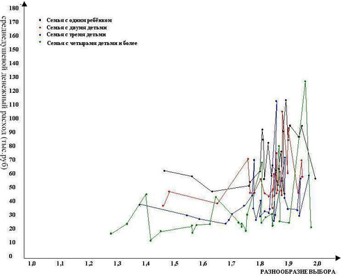 С увеличением численности семей разнообразие потребительского выбора снижается, что вызвано необходимостью сосредоточения ограниченных расходуемых средств на самых необходимых товаров.