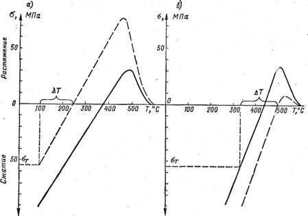 Рис. 33.1. Изменение напряжений в стекловидном эмалевом покрытии при изотермической выдержке (а) и при направленной кристаллизации (б)