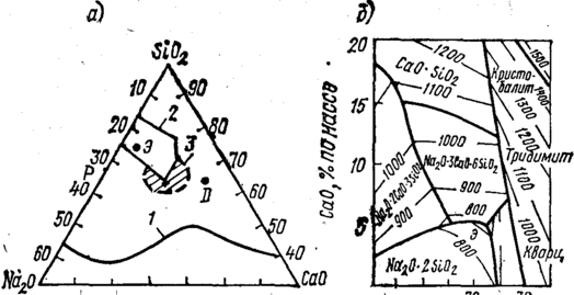 Рис. 4.1. Область стеклообразования в системе Na2O—CaO— SiО2 (а) и диаграмма состояния части тройной системы (по Морею) (б), имеющая значение для технологии стекла