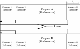 Однопарный кабель используется в качестве абонентских линий и прокладывается на каждом этаже с обеих сторон (А и В). Следовательно, для каждой стороны требуется