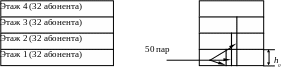 У боковой стены здания абонентские линии собираются в распределительный шкаф, где они объединяются в кабель 50х2. Этот кабель используется для передачи сигнала в вертикальном направлении к первому этажу. Таким образом, для каждого корпуса потребуется