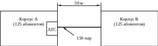 50-парные кабели с отдельных этажей корпуса В собираются на первом этаже в распределительном шкафу, где они объединяются в 150-парный кабель, идущий от корпуса В к корпусу А, где установлена АТС. Требуемая длина кабеля приблизительно соответствует расстоянию между корпусами (около 50 м) с некоторым запасом, т.е. около 60 м.