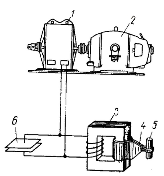 Закалка токами высокой частоты по методу В.П. Вологдина нашла очень широкое применение в промышленности, так как отличается высокой производительностью, легко поддается управлению и обеспечивает хорошее качество. Закаливаемая деталь 5 (рис. 9) помещается в индуктор (катушку) 4, по которому пропускается ток высокой частоты. Ток поступает через трансформатор 3 от машинного генератора 1, приводимого во вращение электродвигателем 2. Возбуждаемый при этом в детали ток имеет наибольшую плотность у поверхности и быстро нагревает поверхность детали. Когда нагрев закончен, деталь обрызгивается водой из индуктора, который для этого делается полым с отверстиями.