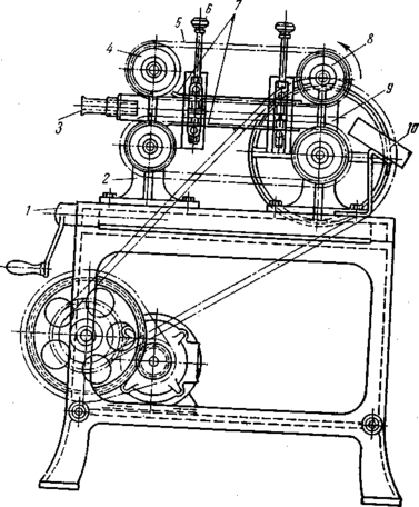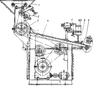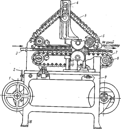 1 — натяжной механизм, 2 и 9 — стойки, 3 — направляющая втулка, 4 — направляющие ролики, 5 — формующие цепи, 6 — винты для регулировки сближения цепей, 7 —> нажимные полозки, 8 — ведущая звездочка, 10 — лоток.