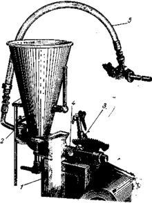 станина, 2 — клапан, 3 — регулятор подачи, 4 — плунжер, 5 — резиновый шланг.