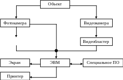Видеокамера, фотокамера, видеобластер и сканер (в системе может использоваться либо подсистема “фотокамера-сканер” либо подсистема “видеокамера-видеобластер”) являются важными составляющими частями системы и предназначены сохранить и передать полученное от микроскопа изображение с минимальными искажениями в ЭВМ. Естественно чем выше разрешение и чувствительность камеры, а также разрешение видеобластера или сканера, тем более полно изображение, которое они формируют, соответствует оригиналу.