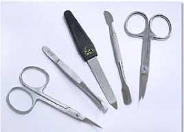 Основные инструменты для выполнения маникюра, педикюра включают: кусачки или маленькие ножницы для ногтей и для кожи, лопаточки (шабер) и деревянные или костяные палочки для обработки кутикулы, пилочки различной зернистости, предпочтительно стеклянная пилка. (В ПРИЛОЖЕНИИ представлены инструменты для выполнения маникюра и педикюра фирм DEWAL и VIPER SOLINGEN).