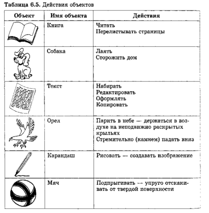 Путем перечисления действий можно довольно точно описать объект. Птиц характеризует то, что они могут летать. Однако если вы посмотрите вверх и увидите птицу, которая парит в небе, а потом вдруг камнем падает вниз, то можно предположить, что это орел или сокол, поскольку именно для этих птиц свойственны такие действия. В таблице 5 представлены примеры некоторых рассмотренных ранее объектов и указаны характерные для них действия.