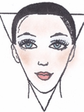 Треугольное лицо напоминает сердечко, верхняя часть лица более широкая по сравнению с узкой нижней частью. Характерен ярко выраженный острый подбородок. Для уравновешивания пропорций необходимо затемнить височную область лба и лобные бугры, также затемнить подбородок, высветлив при этом линии нижней челюсти. Основные румяна наносят на выступающую часть скул в форме ромба.