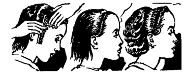 Примерно определив требуемое количество волн и порядок их размещения на волосяном покрове головы, приступают к укладке. Отступают от пробора на 3—4 см и зажимают волосы средним пальцем левой руки. Если необходимо получить более резкую обратную лобную волну, ее обработку начинают в 5—6 см от пробора. Затем вводят зубья расчески в волосы у среднего пальца и движением ее влево придают волосам нужное направление от лба. Далее наклоняют обушок расчески к себе, а указательным пальцем левой руки прижимают волосы у образовавшейся линии волны. После этого тщательно расчесывают волосы, начиная от указательного пальца. При этом необходимо следить за тем, чтобы нижние слои волос были хорошо прочесаны. Затем перемещают средний палец левой руки на 3—4 см от полученного крона и прижимают им полосы. Вводят зубья расчески в волосы у среднего пальца и придают им направление вправо. В этом случае следует помнить, что при движении расчески вправо целесообразно начинать обработку участка головы волос с правой стороны участка.
