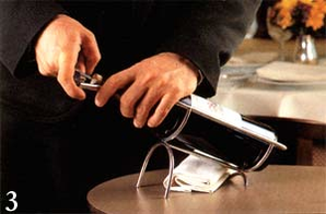 После того, как все эти меры предосторожности приняты, сомелье дает попробовать вино заказчику. Если оно его удовлетворяет, официант может переходить к обслуживанию других гостей, которым вино наливается с правой стороны. Во время обслуживания сомелье держит бутылку таким образом, чтобы была видна этикетка.