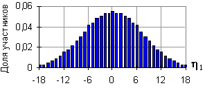 Второе требование к олимпиадным заданиям – они должны быть максимально приближены к идеальному сбалансированному комплекту, то есть должны в равной степени затрагивать продуктивную и репродуктивную деятельность школьников. Это выражается симметрией точек на шкале сложности (см. выше) относительно биссектрисы главного координатного угла. На распределении по суммарному баллу (S, ή1) приближение к сбалансированному комплекту выражается в колоколообразном виде этого распределения.