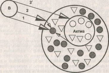 Давно установлено, что непосредственное воздействие педагога на ученика по ряду причин может быть малоэффективным. Лучшие результаты дает воздействие через окружающих его школьников. Это учитывал А. С. Макаренко, выдвигая принцип параллельного действия. В его основе — требование воздействовать на школьника не непосредственно, а опосредованно, через первичный коллектив. Сущность этого принципа наглядно представлена на условной схеме, предложенной И. П. Подласым25 (рис. 1). Так он, основываясь на трудах А.С.Макаренко, он пишет, что каждый член коллектива оказывается под «параллельным» воздействием, по крайней мере, трех сил — воспитателя, актива и всего коллектива. Воздействие на личность осуществляется как непосредственно воспитателем (параллель 1), так и опосредованно через актив и коллектив (параллели 2' и 2). При повышении уровня