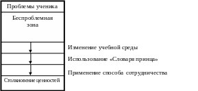 Это очень важный момент — перемещение проблемы из зоны принадлежности учителя в зону принадлежности ученика. Как только вы заметите по невербальным и вербальным признакам, что проблема уже не ваша, следует немедленно поменять тактику собственного поведения. Мы опять возвращаемся к уже рассмотренным способам из «Словаря принца» — пассивному и активному слушанию, сообщению о переживаемом. Короче — к поддержке и консультированию, помощи ребенку, у которого теперь возникла проблема. Это еще раз демонстрирует школьнику, что педагог его понимает и принимает.