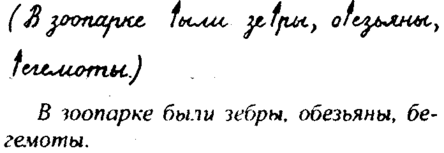 Конечно, могут быть и другие причины ошибок, общие для всех их типов, например: недостаточная координированность движений руки пишущего, неправильное положение тела при письме, плохая освещенность или плохое зрение, механические помехи (плохое перо неровная бумага или, вернее неровная поверхность стола под бумагой) и т. п. Не следует забывать и о таких ошибках письма, которые нельзя определить как графические: несоблюдение строчки, переписывание через линию полей, непропорционально большие (или маленькие) интервалы между словами, недописывание строки и пр. Часты ошибки в соединениях букв.