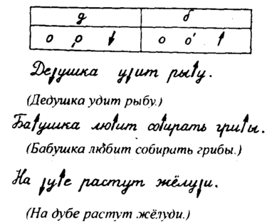 Например, дети уже умеют писать букву а, и им нужно научиться писать букву д. Они сами подходят к способу письма буквы д: нужно у буквы а оставить полуовал, а палочку с загибом заменить на длинную палочку (черту) с петлей внизу. Движение руки при написании буквы д такое же, как и при письме буквы а.