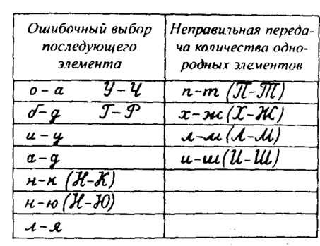 Одним из наиболее стойких типов специфических ошибок письма являются смешения букв, начертание первого элемента которых требует тождественных движении руки. Это так называемые ошибки по кинетическому сходству.