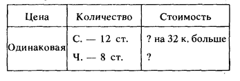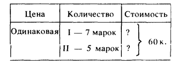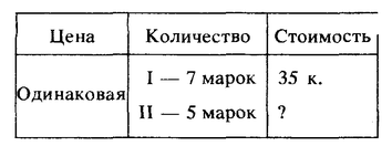 Два мальчика купили марки по одинаковой цене. Первый купил 7 марок, а второй 5 марок. Марки первого мальчика стоили 35 к. Сколько стоили марки второго мальчика?» Ученики устно решают эту задачу и узнают, что марки второго мальчика стоили 25 к. Учитель записывает это число. В таблице вместо вопросительного знака и предлагает найти сумму чисел, обозначающих стоимость марок. Выясняется, что 60 к. уплатили за марки оба мальчика. В краткую запись вносятся изменения: