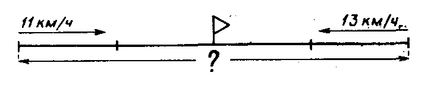 «Два велосипедиста выехали одновременно навстречу друг другу из двух поселков и встретились через 2 ч. Скорость одного из них 11 км/ч, а другого 13 км/ч. Найти расстояние между поселками». После чтения задачи выполняется под руководством учителя чертеж: