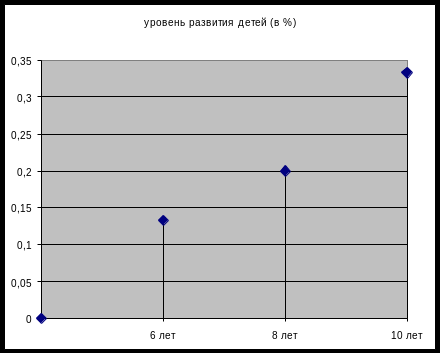 Полученные данные позволяют сделать вывод, что дети шестилетнего возраста имеют низкий уровень развития, затем от шести до восьми лет, учитывая данные исследования, кривая развития начинает расти, а от 8 до 10 лет – снижается. Но, хотелось бы отметить, что у детей шестилетнего возраста, хотя и ниже, чему у других испытуемых ярко выражено стремление составить как можно больше слов, один из испытуемых составил 10 слов, что по данным таблицы характеризуется кА высокий уровень, но поскольку в словах были допущены орфографические ошибки и использованы буквы те, которые отсутствовали в исходном слове, приведенные испытуемым новые слова не учитывались при установлении уровня развития.