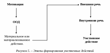 5. Формирование действия во внешней речи про себя. Действие приобретает умственную форму, автоматизируется.