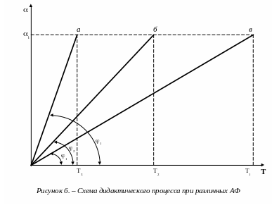 Какова же роль в принципиальных возможностях дидактического процесса АФ в формировании опыта и алгоритма управления АУ, а также мотивационного компонента процесса. Деятельность учащегося по усвоению учебного материала должна строиться с использованием некоторой гипотезы. Чем она более адекватна природе формирования психики человека, тем быстрее и легче идет процесс овладения деятельностью. На рисунке 6 показаны гипотетические характеристики различных дидактических процессов, п остроенных с использованием различных АФ.