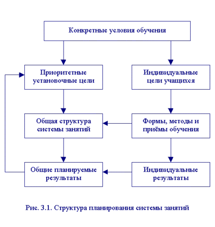 з схемы видно, что установочные и индивидуальные цели формулируются на основе конкретных условий обучения с учётом целей учителя и учеников. Достижение целей зависит от выбора базовой технологической структуры занятий, оптимального набора форм и методов обучения, индивидуальных программ.