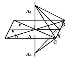 В учебнике дано слово “пересекающиеся” прямые. Здесь приведено традиционное доказательство, основанное на применении признаков равенства треугольников. Одно из первых доп. построений- проведение через точку А произвольной прямой Х, что необходимо для того чтобы доказать справедливость определения прямой, пересекающей плоскость, этой плоскости. Вторая часть доп. построений: AА1=AА2, произвольная прямая СВ, пересекающая прямые b, х, с. А1С, А1Х, А1В, А2С, А2Х, А2В - для образования треугольников, равенство которых будет доказано.
