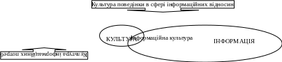Професійно-педагогічна культура вчителя є відкритою системою. Розвиток цієї інтелектуальної системи залежить від ступеня надходження, опрацювання й ефективного використання інформаційних потоків із навколишнього середовища. Останнє означає, що сучасний учитель має бути відкритим до сприйняття інформації. З огляду на перенасиченість її в сучасному суспільстві, складність і різноманітність інформаційних технологій він має володіти високим рівнем ІК. Очевидно, що поняття ІК генерується двома фундаментальними поняттями: культура та інформація, відтворюючи їх взаємозв’язок і взаємовплив (рис.1.).